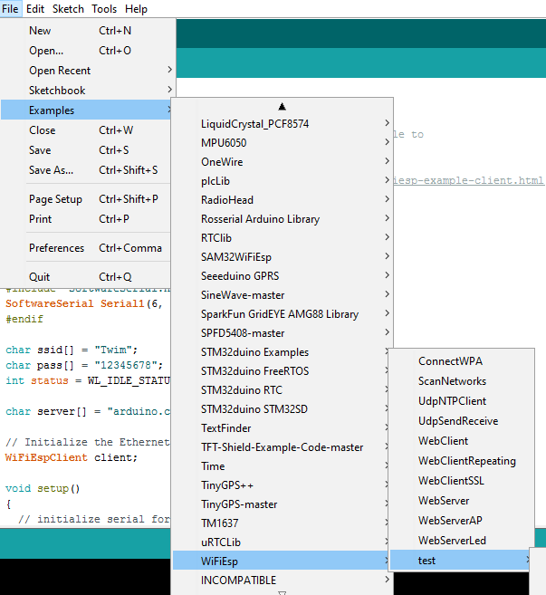 Lalu carilah contoh-contoh sketch-nya yang terdapat pada menu FILE > EXAmples > cari dan pilih WiFiESP, seperti pada gambar 5